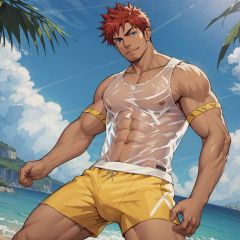 ((masterpiece)),((best quality)),8k,high detailed,ultra-detailed,anime,CG,{{Masterpiece, Best Quality, Extremely Detailed CG, Unity 8k Wallpaper }},1boy,topless, summer,dark skin,red hair,blue eyes, see-through **** top, boxer briefs,muscular,facial hair,