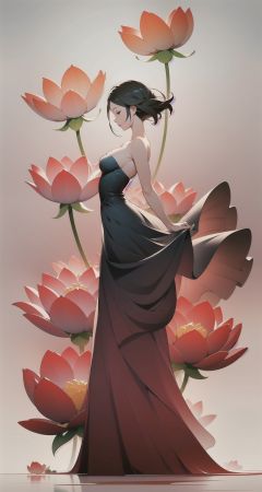 <lora:buyao (1):1>,buyao, 1girl, dress, solo, flower, short hair, red dress, red flower, black hair, black dress, bare shoulders, profile, red theme, long dress, standing, full body, strapless dress, strapless, from side, closed eyes, bangs, sleeveless, gradient, sleeveless dress, gradient background