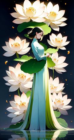 <lora:buyao (2):1>,buyao, 1girl, solo, flower, profile, dress, black hair, hair ornament, long sleeves, holding, short hair, standing, hair flower, grey background, closed eyes, white flower, plant, closed mouth, full body, holding flower, chinese clothes, long dress, from side, reflection, wide sleeves, leaf
