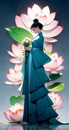 <lora:buyao (2):1>,buyao, 1girl, solo, flower, profile, dress, black hair, hair ornament, long sleeves, holding, short hair, standing, hair flower, grey background, closed eyes, white flower, plant, closed mouth, full body, holding flower, chinese clothes, long dress, from side, reflection, wide sleeves, leaf
