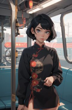 absurdres, highres, ultra detailed, masterpiece, cel shading,(obsolete machine:1.3),retro micro comuter1girl,kid,solo,black hair,asian,chinese clothes,black hair,indoors,train <lyco:GoodHands-beta2:1.0>