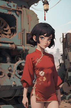 absurdres, highres, ultra detailed, masterpiece, cel shading,(obsolete machine:1.3),retro micro comuter1girl,kid,solo,black hair,asian,chinese clothes,red hair,wasteland,<lyco:GoodHands-beta2:1.0>