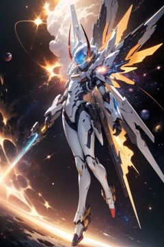 (masterpiece, best quality, ultra-detailed, best shadow),(high resolution,distinct_image),extremely detailed CG unity 8k wallpaper, looking at viewer, Illustration,dramatic angle, robot, mecha, solo, small head, no humans, standing, science fiction, gradient, redesign, (big bang, space, cosmic, galaxy background:1.4), ((blue)),gem, crystal, white body, red, ((full body,long legs,small head, luminous crystal body)),flames wing, horns, white, (weapon), (mecha \(mjstyle\) )