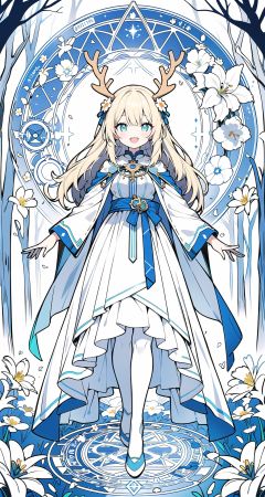 (magic circle:1.3),(masterpiece:1.2),high_quality,occultism,Aestheticism Painting,(flat color),best quality,soft lighting,depth_of_field,(solo:1.4),[close-up],blond hair,(1girl),large breasts,detailed beautiful green eyes,(light blue eyes:1.2),messy_long_hair,beautiful_deer_antlers,archbishop_robe,largr_sleeve,grey_cloak,blooming,looking_at_viewer,lily (flower),colorful butterfly,(fantastic colorful),fluorescence,(forest:1.25),tree_shade,(flowers meadows:1.4),fantasy,:D,