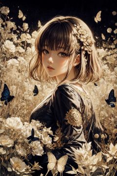 abstract art, (style of Yuko Shimizu:1.3), (black theme:1.1), gold theme, golden butterflies, dark stars, 1girl, field of white flowers, , facing viewer