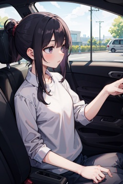 (masterpiece), best quality, high resolution, highly detailed, detailed background, perfect lighting, 1girl, indoors, low ponytail, in car,