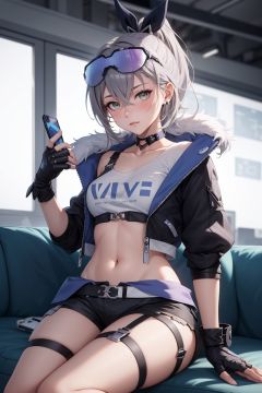 masterpiece, best quality, SilverwolfV5, 1girl, solo, looking at viewer, shirt, gloves, holding, sitting, jacket, shorts, choker, black gloves, fingerless gloves, black jacket, short shorts, thigh strap, phone, black shorts, goggles, eyewear on head, goggles on head,