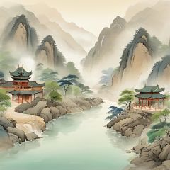 guofeng,illustration,masterpiece,traditional Chinese painting,majestic landscape,steep mountains disappearing into mist,wispy clouds,bold brushstrokes texture,flowing river winding through,waterfalls plunging down cliffs,tiny bridge over stream,small pavilion perched top of peak,balanced composition,impressionistic style,wet ink diffusing on rice paper,empty white space,high viewpoint,tranquility mood,signing chop mark in corner,<lora:国风插画SDXL:1>,