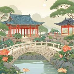 guofeng,illustration,masterpiece,traditional Chinese courtyard garden,symmetrical layout,moon gates,winding pathways,tranquil ponds with lilies,stone bridges over streams,manicured penjing trees,ornate pavilions,red pillars and black tiled roofs,bonsai pine on pedestal,blooming peonies and roses,butterflies and songbirds,pagoda peeking over wall,peaceful and contemplative mood,light mist,extremely detailed,shallow depth of field,soft natural lighting,cinematic composition,<lora:国风插画SDXL:1>,