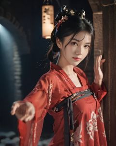 A cinematic upper body photograph of a female in a dungeon, (she wearing red hanfu), shadows, black hair, dynamic scene, epic pose, highly detailed face, seductive smile, black eyes, cinematic, fujifilm, intricate, detailed, raw photograph,<lora:tangStyle_sdxl_autodl_v11-000027:0.8>