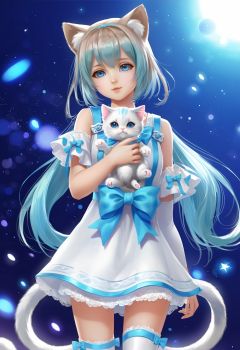 masterpiece, best quality, kawaii,adorable girl,little girl,bishoujo,cute,long hair,light brown hair,hair between eyes,ahoge, blue eyes,beautiful detailed eyes,aqua eyes,cat_ears,blue hairbow,white kneehighs,white dress,white infrared sleeve,((beautiful detailed face)), (beautiful detailed eyes),boots,full body,white glove,cute face,happy