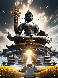 finely detail, Depth of field,(masterpiece),(((Extremely realistic))),((extremely detailed CG unity 8k wallpaper)),best quality,high resolution illustration,Amazing,(detailed,clear and beautiful:1.4),intricate detail,(best illumination, best shadow, an extremely delicate and beautiful),Detailed beautiful and aesthetic,1figure of Buddha,Gatling gun, electron,(many floating firearms:1.2),All kinds of weapons were floating around the statue,View from below,Global Illumination,auspicious cloud and golden cornfield,Nan Wusan,holy light,oppressive,Sharp Focus