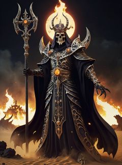 photo of a fearsome and magnificent corpse (god of death), sand tomb keeper, lord of the underworld, master of the secret arts, magician of doom, envoy of the shadows, bringer of despair and torment, scourge of the earth, ender of all, supreme being, almighty warlock, harbinger of calamity, herald of the void, the final force, demon overlord, dark monarch, ghastly monster, inescapable demise, ruler of the abyss, primeval fiend, eternal annihilator, the atrocity, grim ripper, origin of the sorrow, root of pain and misery, source of the darkness, hell personified, confident and proud, dignified and eminent, mighty old king with blank eyes wearing a large royal crown on and an ancient golden royal attire with decorations and white silk robes with sandals, holding an ancient ceremonial staff with multiple candles and large flames in his (corpse hands:1.35), flames above his shoulders, (bone accessories), chains, gemstones, standing in desert at night, looking directly at the viewer, dark, nighttime, midnight, (necromancy, undead, zombie, mummy, corpse, rotting body, rotting face, rotting flesh:1.2), [skeleton], a villain character, (powerful mage, omnipotent necromancer, a sorcerer, a lich), (nightmare, horror), flames of war, (sand, sand dunes, dust, mist), moonlight rays, starry sky, 8k uhd, dslr, sharp focus, soft lighting, (high quality, photorealistic, realism, hyperrealism), masterpiece, concept art, art photography, art nouveau, character art