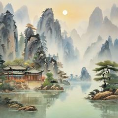 guofeng,chinese style,((summer, Huangshan National Park,painting antient arts style,traditional Chinese painting,painting lake and mountain landscape, mountain reflection on lake surface)),Painting,Volumetric sun Lighting,((high quality:1.2, masterpiece:1.2)),oil landscape,extreme wide perfect composition,(("Mysterious, Enigmatic and Intriguing landscape")),<lora:国风插画SDXL:1>,