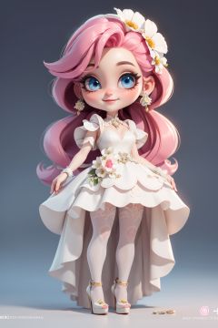 masterpiece, best quality, 8k, cinematic light, ultra high res, 1girl, mature, chibi, pink hair, blue eyes, long hair, wedding_dress, high heels, white pantyhose, flower, smile, earrings, jewelry, standing, full body, <lora:chibi_04:1:TEST>