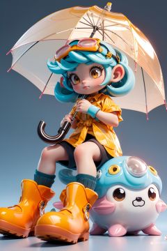 masterpiece, best quality, 8k, cinematic light, ultra high res, chibi, 1girl, holding umbrella, rubber boots, sitting, boots, solo, tentacle hair, skirt, transparent, short sleeves, long hair, raincoat, blue hair, brown eyes, yellow footwear, shorts, goggles, shirt, transparent umbrella, full body, <lora:chibi_05:1:TEST>