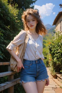 Best quality,masterpiece,ultra high res,1girl,landscape with light,look at the camera,shorts,
