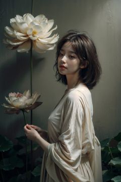 8k,Moody,atmospheric,painterly,fine details,cinematic composition,Warm lighting,gentle,nostalgic,flower,roses,tranquil,evocative,hazy atmosphere,a sense of solitude,dreamlike atmosphere,high level of detail,evocative color palette,8K resolution,<lora:33333333333danse:0.6>,lotus,white atmosphere,<lora:调细节添加-2-2修手detail tweaker:1.0>