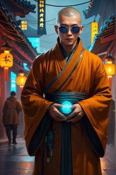cyberpunk monk in china, delightful anatomy:1. 1 , gloomy illumination, insane, stunning, dramatic, completed artwork, HQ:1. 1, Vivid colors, 16k, UHD, HDR10, (Masterpiece:1. 5) (best quality:1. 5), very detailed eyes, full body