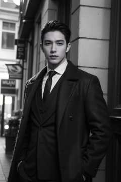 handsome male,big muscle,suit,feather coat,monochrome photography,dutch angle,outdoor