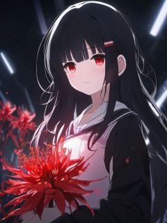 face focus, cute, masterpiece, best quality, 1girl holding lycoris, black background, light particle, solo, black hair, red eyes, standing, pixiv, depth of field, cinematic compotision, best lighting, looking up