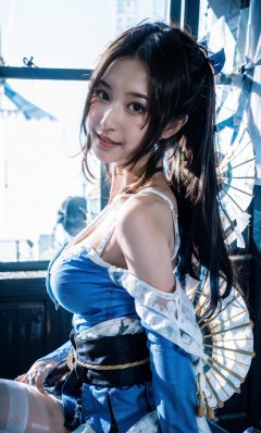 huowu,1girl, solo, black hair, long hair,white thighhighs, chair, high heels, cosplay,((upper body)),young and beautiful, tall and beautiful, fair face, perfect features, tall and beautiful, fair skin, good figure, 4k,cg,Bust shotholding fan, blue theme,gameCG background,3Drender,realistic,cinematic lighting,smooth fog,detailed face, <lora:chilloutmixss_xss10:0.1> <lora:japaneseDollLikeness_v10:0.3>light smile, (((The Architectural Background of Japanese Style)))