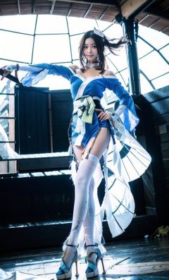 huowu,((1girl)), ((solo)), black hair, long hair,white thighhighs, chair, high heels, cosplay,((upper body)),young and beautiful, tall and beautiful, fair face, perfect features, tall and beautiful, fair skin, good figure, 4k,cg,Bust shotholding fan, blue theme,gameCG background,3Drender,realistic,cinematic lighting,smooth fog,detailed face, <lora:chilloutmixss_xss10:0.1> <lora:japaneseDollLikeness_v10:0.3>light smile, (((The Architectural Background of Japanese Style)))