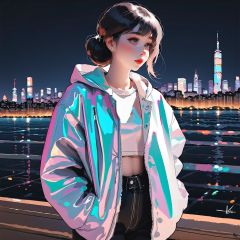 holographic cloth,leishe,laser,a 20yo girl,masterpiece,best quality,highly detailed,city_background,nights,shallow depth of field,(style of Shawn Coss:0.6)