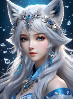 masterpiece, best quality,official art, extremelydetailed cg 8k wallpaper,(flying petals)(detailed ice) , crystalstexture skin, coldexpression, ((fox ears)),white hair, longhair, messy hair, blue eye,looking at viewer,extremely delicate andbeautiful, water, ((beautydetailed eye)), highlydetailed, cinematiclighting, ((beautiful face),fine water surface, (originalfigure painting), ultra-detailed, incrediblydetailed, (an extremelydelicate and beautiful),beautiful detailed eyes,(best quality)