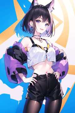 masterpiece, best quality,PIXIV,1girl, solo, black hair, pantyhose, o-ring, purple eyes, breasts, shorts, looking at viewer, bare shoulders, hand on hip, smile, jewelry, short hair, earrings, animal ears, black shorts, collarbone, medium breasts, multicolored hair, midriff, virtual youtuber, fake animal ears, crop top, bangs, cowboy shot, closed mouth, long sleeves, puffy sleeves <lora:nardack_20230801103151:1>