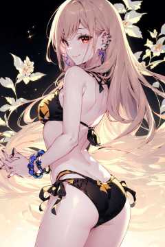 masterpiece, best quality,PIXIV,1girl, swimsuit, solo, bikini, black bikini, long hair, jewelry, kitagawa marin, side-tie bikini bottom, ass, bracelet, breasts, blonde hair, multi-strapped bikini, blush, white background, piercing, simple background, string bikini, looking at viewer, ear piercing, earrings, red eyes, halterneck, cowboy shot, medium breasts, bangs, closed mouth, bead bracelet, industrial piercing, floral print, beads, smile, bare shoulders, barbell piercing, multicolored hair, holding hair, nail polish, print bikini, gradient hair, back <lora:nardack_20230801103151:1>