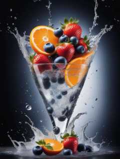 (Cinematic Photo:1.3) of (Realistic:1.3) a studio shot of a (exploding:0.2) (Fruit in low gravity:1.1) (Splashing:0.9) a glass of water with strawberries, oranges and blueberries in it, splash image, full-color, on a canva, splashes of liquid, drinks, a fruit basket, strong red hue, hgh, evokes delight, water swirling, by Fred Marcellino, top selection on unsplash, professional food photography, art photography. black background
