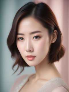 Professional photograph of a beautiful korean woman, medium shot, studio lighting, pastel colors, foreground, photorealism, shot on a Pentax 645Z, 85mm lens 1.4 aperture, complex background