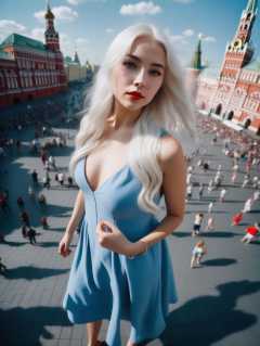 from above/high angle documentary photography analog style shot A young woman in a blue sundress with long white hair and bright make-up on a summer day in Moscow on Red Square in 3078. f1.4