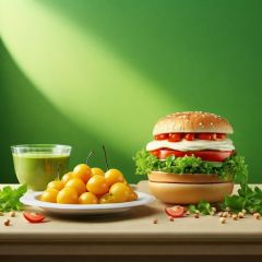 Best quality,masterpiece,ultra high res,booth,no humans,food focus,still life,food,simple background,green background, <lora:食物桌面:0.8>