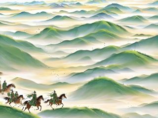 <lora:sdxl_shenhua_v2:1>,shenhua,a team of soldiers rode their horses over the hillside,ahead is a vast expanse of grassland,