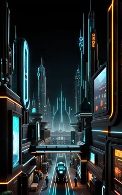 realistic, science_fiction, A futuristic world of robots and mechs navigating neon cities.