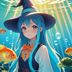 flat color),colorful,(masterpiece:1,2), best quality, masterpiece, highres, original, extremely detailed wallpaper, looking at viewer, (close-up),((colorful)),(Detailed eyes description), (8K wallpaper), (masterpiece,best quality,ultra-detailed,illustration),(cinematic lighting),dreamy atmosphere,(bubble),warm light,1girl,solo (little girl:1.5),(1girl),(Station type,Telephoto lens, wide Angle lens),First person,Depth of field 1girl,solo,loli, expressionless,(+++a girl with lightblue long gradient hair and orange aqua eyes+++:1.2),with butterfly,standing, constricted pupils, (hair flowers),small breasts, long bangs,hime cut,(solo:1.5),Long hair, wavy hair, curly hair, fall clothes, ((dark blue wizard hat)), blush, (((, The aquarium,)))Exhibit box, water, fish, jellyfish, turtles