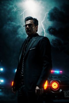 guiltys, a detective man, tuxedo on, thriller theme, upper body, deal with it, synthwave theme, dramatic mood, (bokeh:1.1), depth of field, style of Casey Baugh, tracers, vfx, splashes, lightning, light particles, electric, police departament background, signs, illustration, artstation, smoke, fog, steam