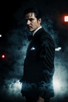 guiltys, a detective man, tuxedo on, thriller theme, upper body, deal with it, serious theme, dramatic mood, (bokeh:1.1), depth of field, style of Casey Baugh, tracers, vfx, splashes, light particles, police departament background, signs, illustration, artstation, smoke, fog, steam