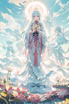 masterpiece, best quality,PIXIV,guanyin,Elaina,Lotus throne,She is sitting on a lotus throne,own hands together,Behind her is a giant glowing Buddha ,Thousand-Hand Kwan-yin,purple eyes,<lora:guanyin_20230801144229:0.4>