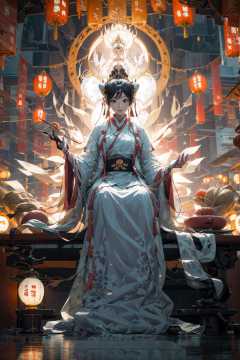 guanyin,hanfu, lantern, chinese clothes, sitting, black hair, jewelry, holding, earrings, 1girl, scroll, looking at viewer, long sleeves, solo, hair ornament, full body, indoors, paper lantern, architecture, shawl, hair bun, tassel, smoking pipe, robe<lora:guanyin_20230801144229-000018:1>