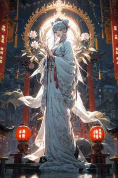 guanyin,flower, 1girl, chinese clothes, holding, jewelry, hanfu, candle, dress, looking at viewer, earrings, red lips, long sleeves, solo, lotus, string, white flower, grey eyes, long hair, tassel, full body, hair ornament, standing, lattice, white hair, shawl, hair bun, grey hair, updo<lora:guanyin_20230801144229-000018:1>