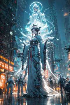 guanyin,(dramatic, gritty, intense:1.4),masterpiece, best quality, 8k, insane details, intricate details, hyperdetailed, hyper quality, high detail, ultra detailed, Masterpiece,Chinese mythology, South Sea Goddess of Mercy Bodhisattva,thousand hands Goddess of Mercy, ( Cyberpunk, Cyberpunk city:1.4),(Cyberpunk lights, light pollution:1.3), glow, white clothes, Chinese gods, Myths and Legends, smoke, tension lens, backlight, luminous clothing,(chinese style architecture),science fiction, workshop,1girl, (Beautiful and detailed facial depiction), Gloom, Sad, ((shiny skin)), {Extremely Delicate Beautiful},(Beautiful and detailed eye description), Delicate Faces, (Winter snow), (Taoist robe), (Upper body), Chinese style clothes,Chinese Han clothing,White and blue Taoist robe, (colored china dress), (hybrid), messy_hair, multicolored hair, (colored tips), shiny hair,((exoskeleton)), (mechanical joints), (mechanical parts), ((internal structure)), (detailed structure), hair rings, mechanical internal structure, delicate internal structure,(cables), (wires), (pistons), electricity, (glowing orbs), (luminous engine), energy cannon, (energy core), (cables connected to body), (wire connected to body), (robotic arms), ((Electronic collar)),Pauldrons, (Scapular cannon), screws, piugs, ventilator fans, 3d, 3d render, beautifully lit, ray tracing,scattered particles, emotionless, Slim waist, outdoors, detailed background, (neon lights), lighting face, full body,Buddha,