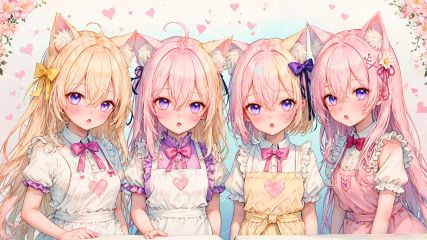 multiple girls, 2girls, animal ears, short sleeves, bow, blush, white apron, puffy short sleeves, long hair, blonde hair, apron, ahoge, dress, puffy sleeves, blue eyes, heart, sleeveless, hair bow, bangs, heart ahoge, parted lips, hair ornament, very long hair, purple eyes, pink dress, hair between eyes, frills, cat ears, x hair ornament, frilled apron, white hair, yellow bow, animal ear fluff, looking at viewer, flower, shirt, bare shoulders, two side up, sleeveless dress, closed mouth, pink bow, hand up, white flower, :o, purple dress, sleeveless shirt, waist apron, pink shirt, center frills