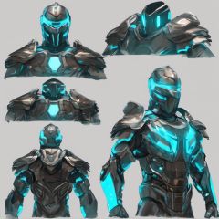 upper body, armor, shoulder_armor, hemlet,  male focus, solo,  realistic:1.5, cityscape, science_fiction, building, glow, metal, cyan,