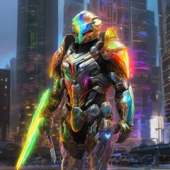 upper body, armor, shoulder_armor, hemlet,  male focus, solo,  (realistic:1.5), cityscape, science_fiction, building, (glow:1.5),  (metal:1.5), (multicolored:1.5), rainbow