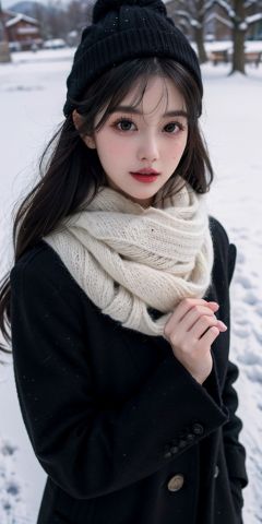 big eyes, soft cheek ,red lip, masterpiece, best quality,1girl, solo, black hair, scarf, hat, realistic, looking at viewer, black eyes, long hair, coat, winter clothes, white scarf, lips, bangs, outdoors, closed mouth, upper body,jennierubyjenes