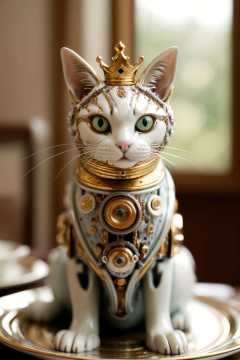 mechanical cat sitting at a fine dining table, wearing a tiny crown, crystal and porcelain plateware wealthy luxurious opulent mansion f/1.4 200mm zoom depth of field ultra sharp photograph, (bright morning sunlight shining:1.2) (masterpiece:1.2) (photorealistic:1.2) (bokeh) (best quality) (detailed skin) (intricate) (8k) (HDR) (cinematic lighting) (sharp focus) <lora:Mechanicalcat:0.7>