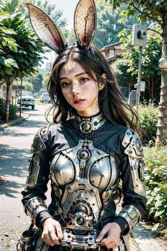 ((masterpiece)), ((best quality)), 8k, high detailed, ultra-detailed, A mechanical rabbit, harmoniously integrated into the beauty of nature, capturing the balance between technology and the environment, ((nature)), ((harmonious integration)), ((technology and environment balance)), gear mechanisms, under the tree,light rays,1girl, <lora:Mechanicalrabbit:0.7>